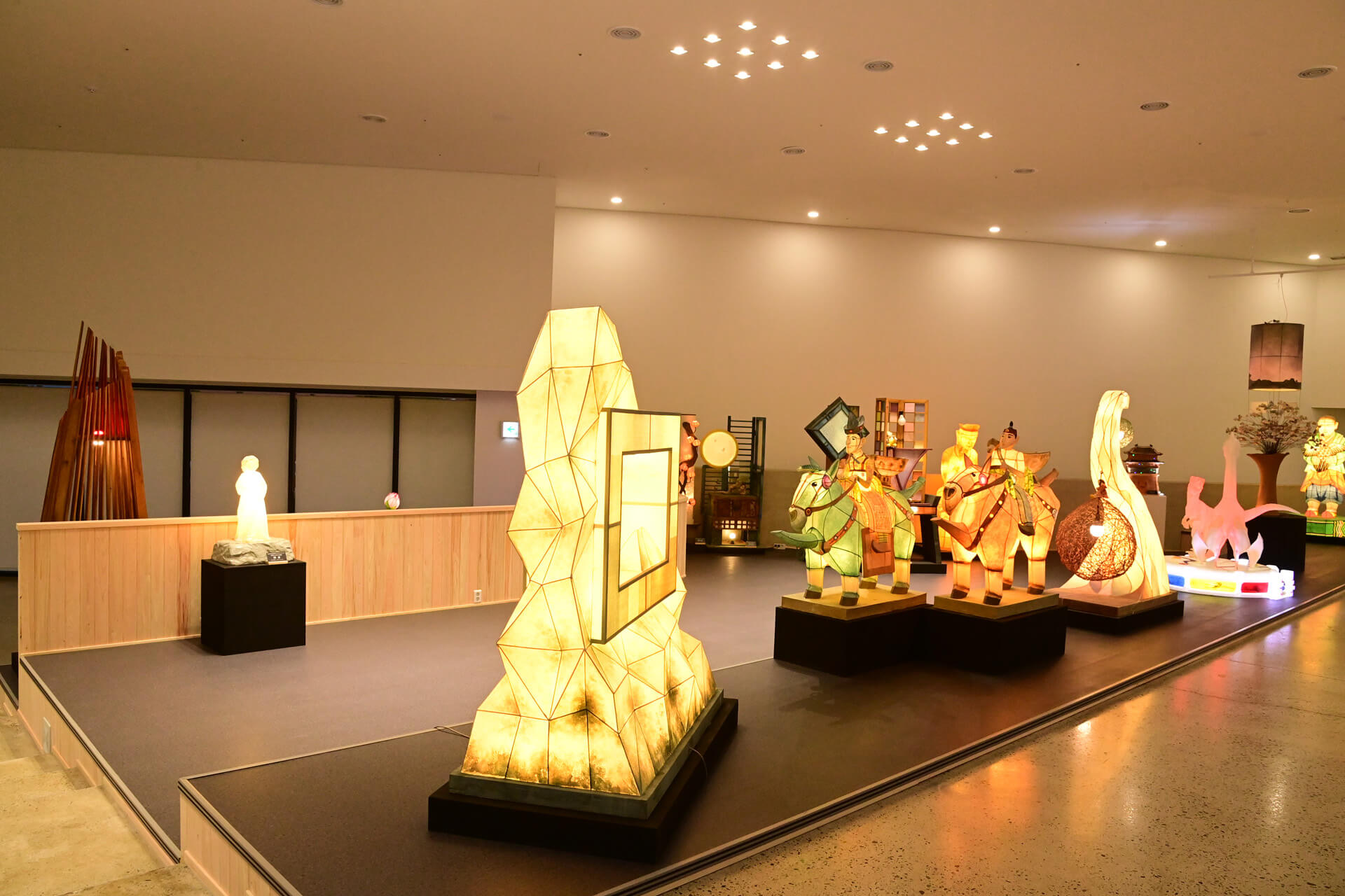 전통 등불 전시:전시관을 방문하시면 다양한 모양, 색상, 크기의 정교하게 제작된 등불을 감상할 수 있습니다. 이 등불은 한국적인 상징, 역사적 장면, 신화 속의 생물을 묘사합니다.